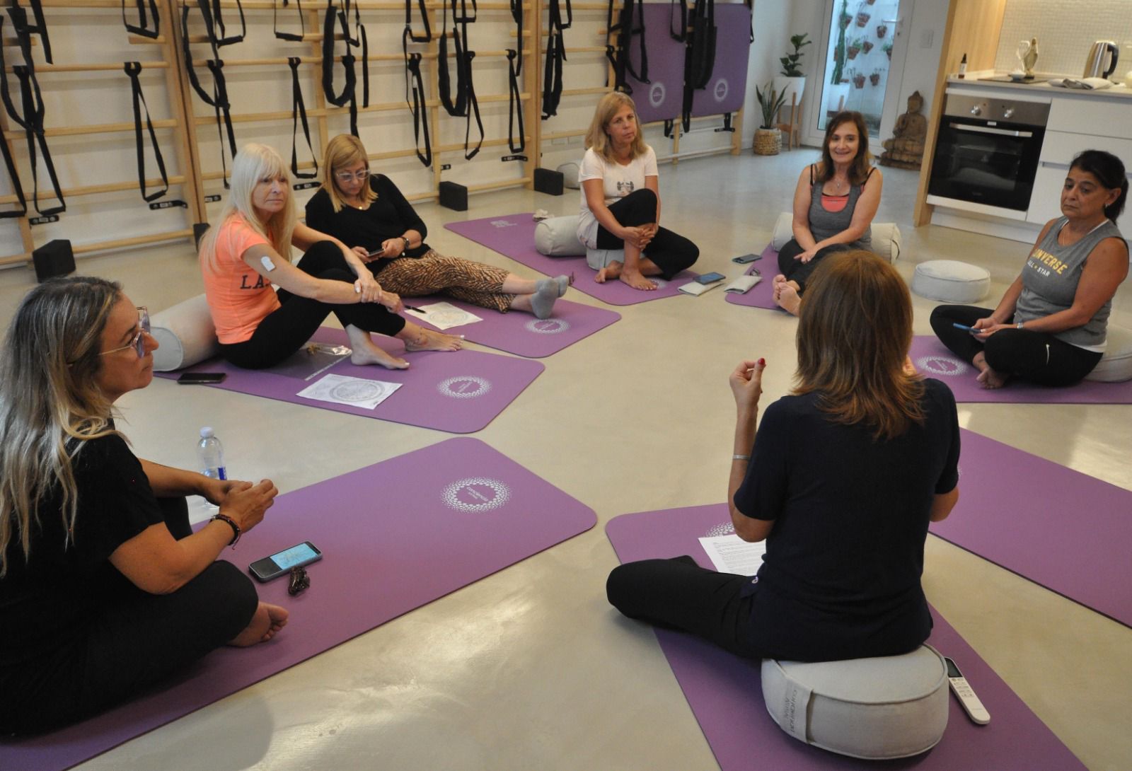 La práctica de Yoga Terapéutico esta siempre asistida con elementos como sillas, mantas, almohadanes que te dan seguridad y sostén.